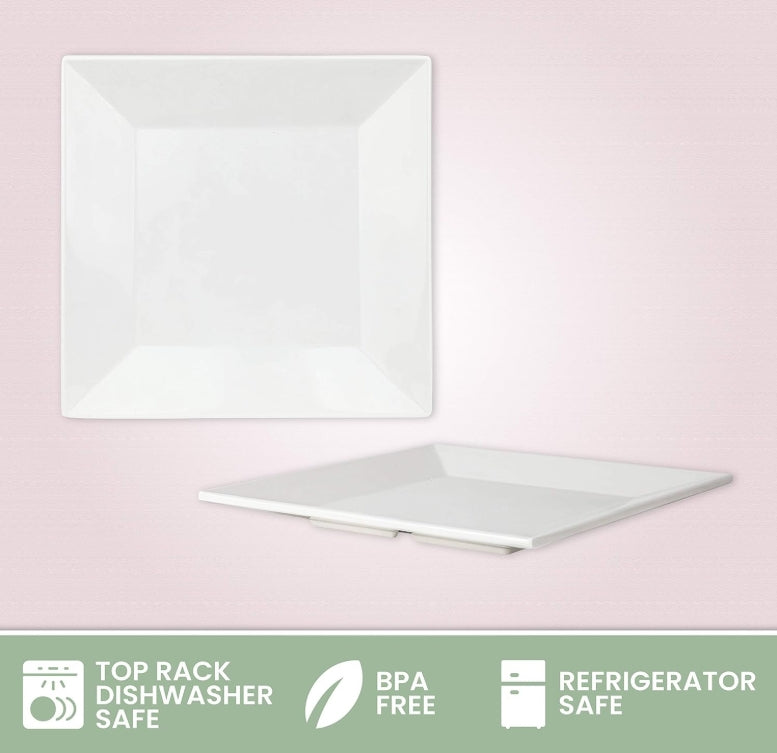 [4 Pack 10" x 10" White Square Melamine Plates, Unbreakable Elegant Dinnerware Set With Sauce Dish